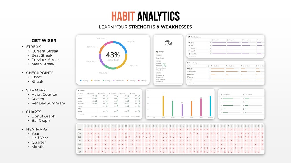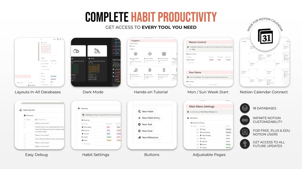 • Habit Tracker (Notion Habit Tracker: Model 1), the high-end habit tracker for building and systemizing your everyday habits inclusive of all aforementioned auxiliary features in one cohesive Notion system