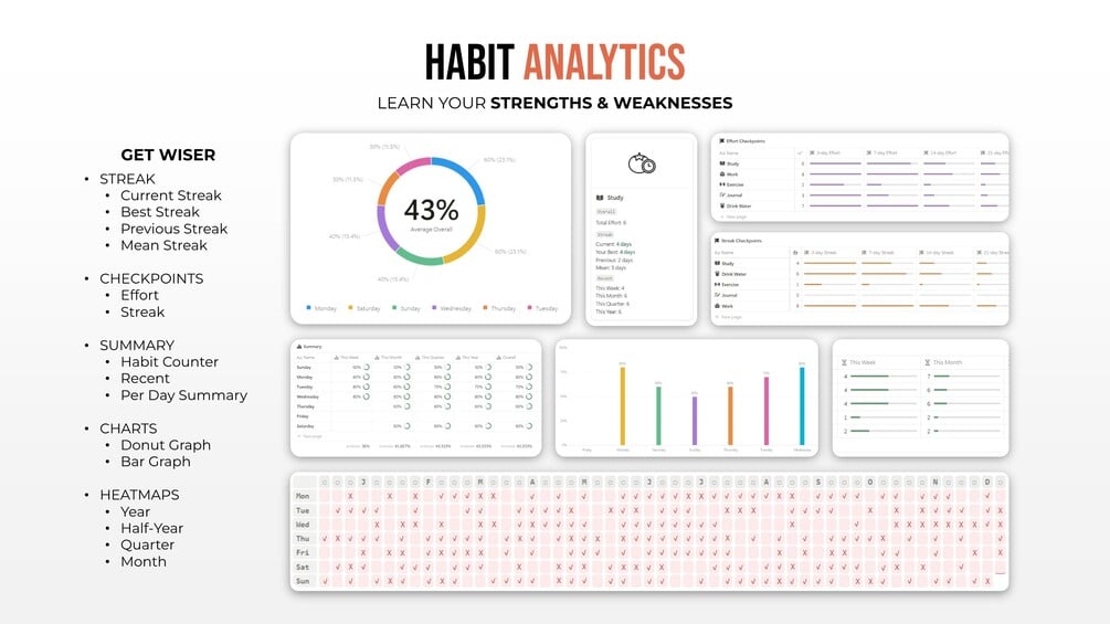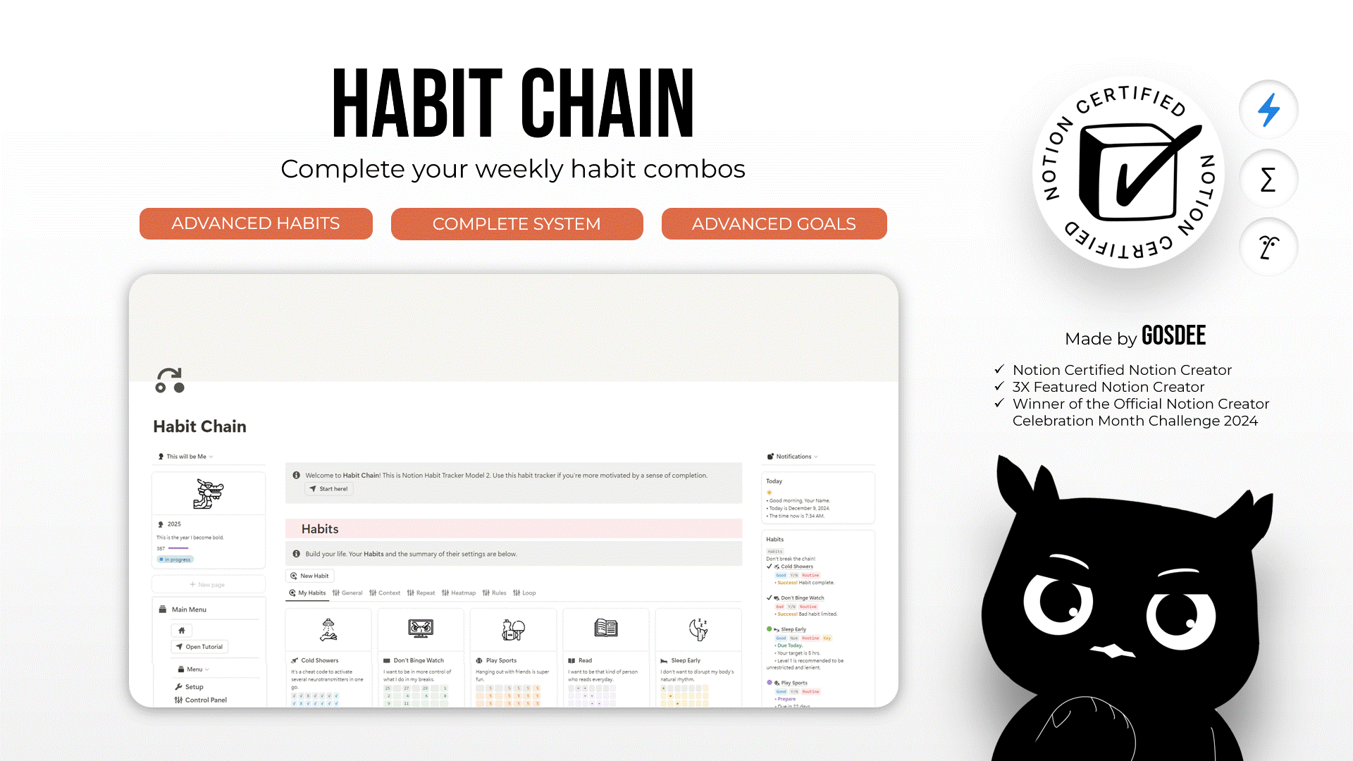 - Habit Chain (Notion Habit Tracker: Model 2), the high-end habit tracker for building and systemizing your weekly habit combos inclusive of all aforementioned auxiliary features in one cohesive Notion system