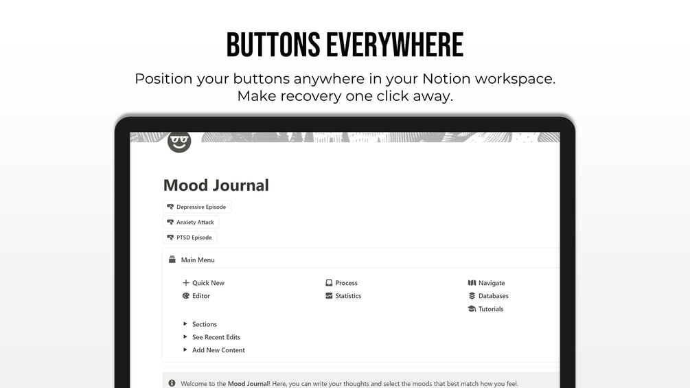 Position your buttons anywhere in your Notion workspace. Restore your headspace without the lag. Make recovery one click away.