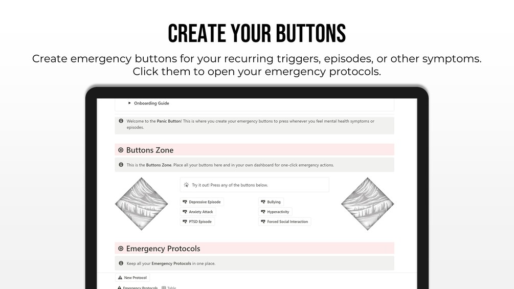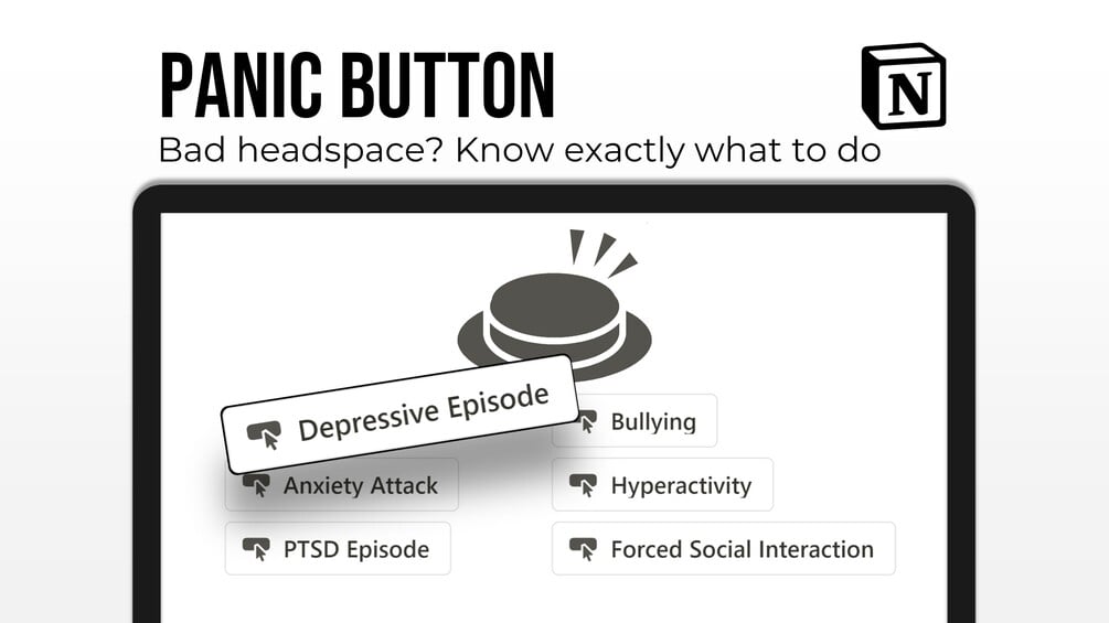 Use the Panic Button to create your own emergency buttons and protocols (containing procedures, reminders, and personal notes) all in your Notion workspace for whenever you experience triggers, episodes, or other mental health symptoms.