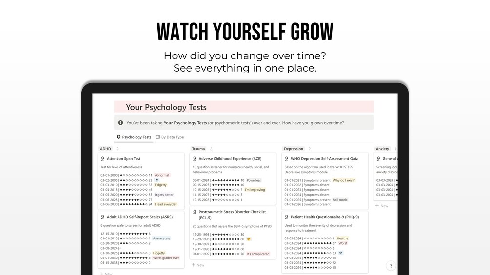 Use the Psychology Test Tracker to watch your answers change over time. All types of scores: psychological, psychiatric, self-administered tests, etc. are welcome.