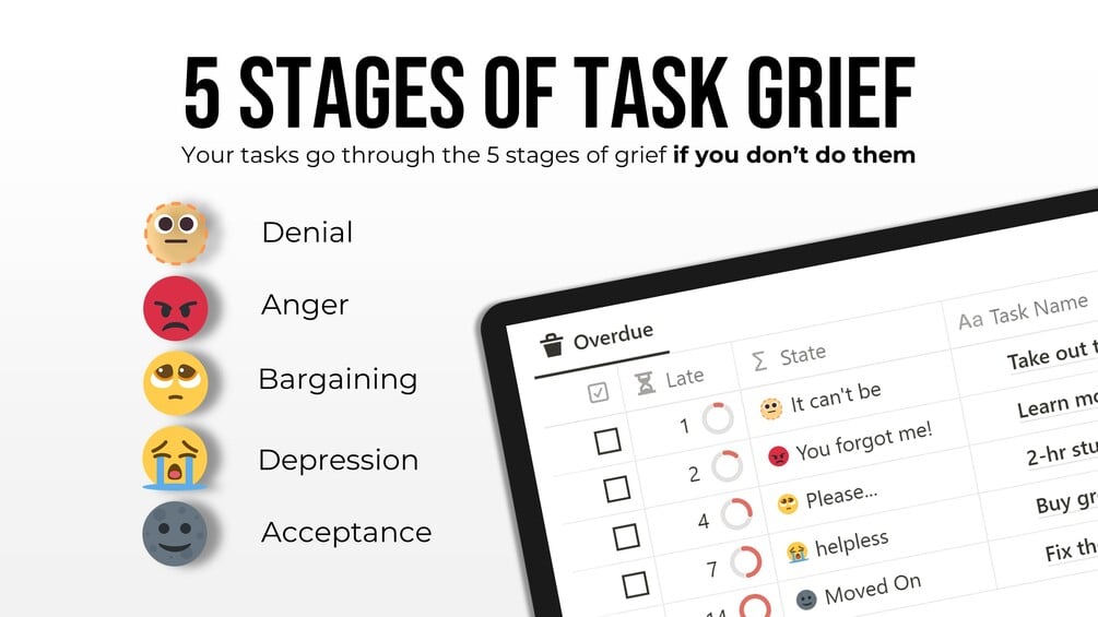 5 Stages of Task Grief — the longer you leave your tasks undone, the further into the 5 stages of grief they go: