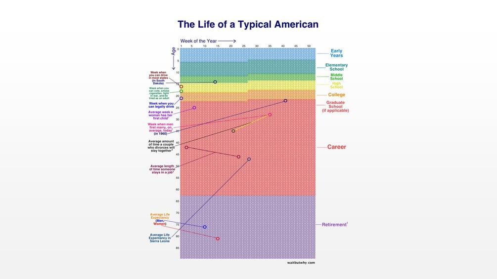 This template is inspired by viral Ted Talk speaker and writer Tim Urban's post "Your Life in Weeks" in the blog Wait But Why.