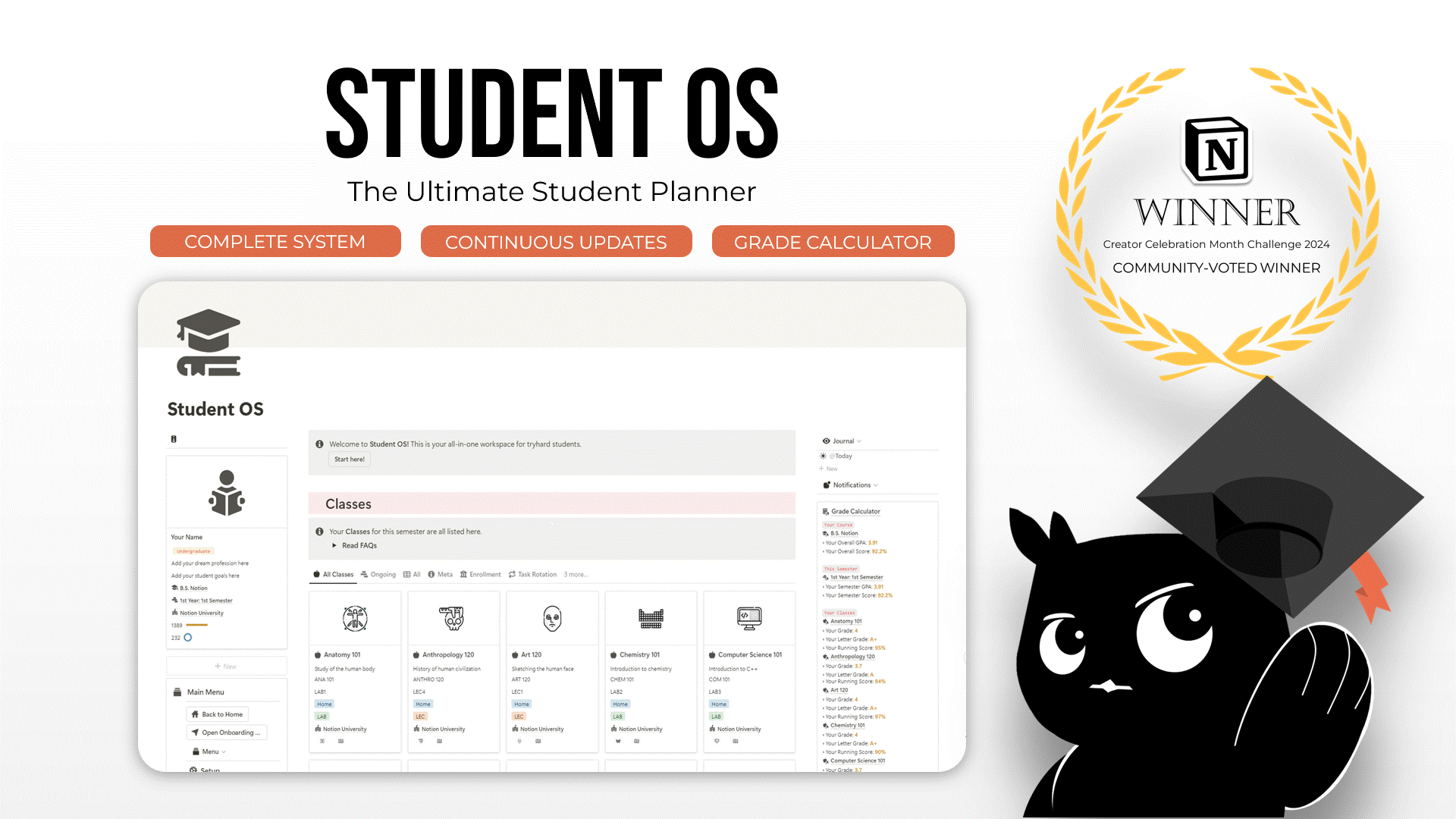 Student OS is the community-voted winner of Notion's official Creator Celebration Month Challenge 2024.